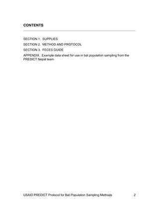 It outlines supplies needed, methods for placing tarps under tree-roosting and cave-dwelling bat colonies to collect urine and feces samples before the bats leave at dawn, and guidance for collecting and recording the samples while minimizing risks to field workers. Examples of bat feces are also provided to help with identification and differentiation from other animal waste.