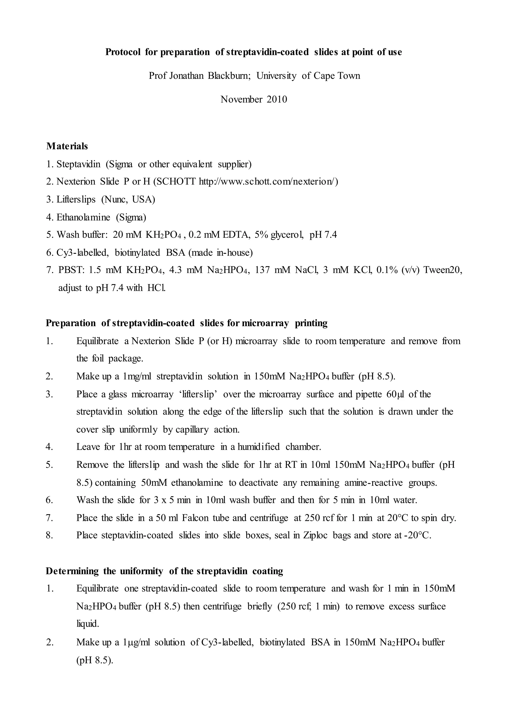 The document outlines a protocol for preparing streptavidin-coated slides for microarray printing at point of use, detailing required materials and step-by-step preparation instructions. It discusses methods for determining uniformity of the streptavidin coating and compares the efficacy of different surface coatings. The protocol aims to reduce shipping costs and maintain the integrity of streptavidin layers by allowing for custom coating of amine-reactive slides on-site.