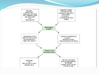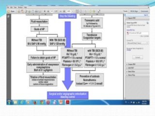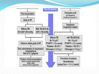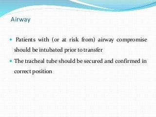 This document provides guidelines for trauma patient transfer and resuscitation protocols. It recommends that prior to transfer, patients with airway compromise should be intubated and ventilation should be stable on a transport ventilator. For circulation, intravenous access should be adequate and the patient should be hemodynamically stable. For trauma resuscitation, lactated Ringer's solution is recommended for fluid resuscitation. Target blood pressures for fluid resuscitation depend on trauma type. Early norepinephrine can limit fluid resuscitation and transfusion of blood products should aim to prevent traumatic coagulopathy.
