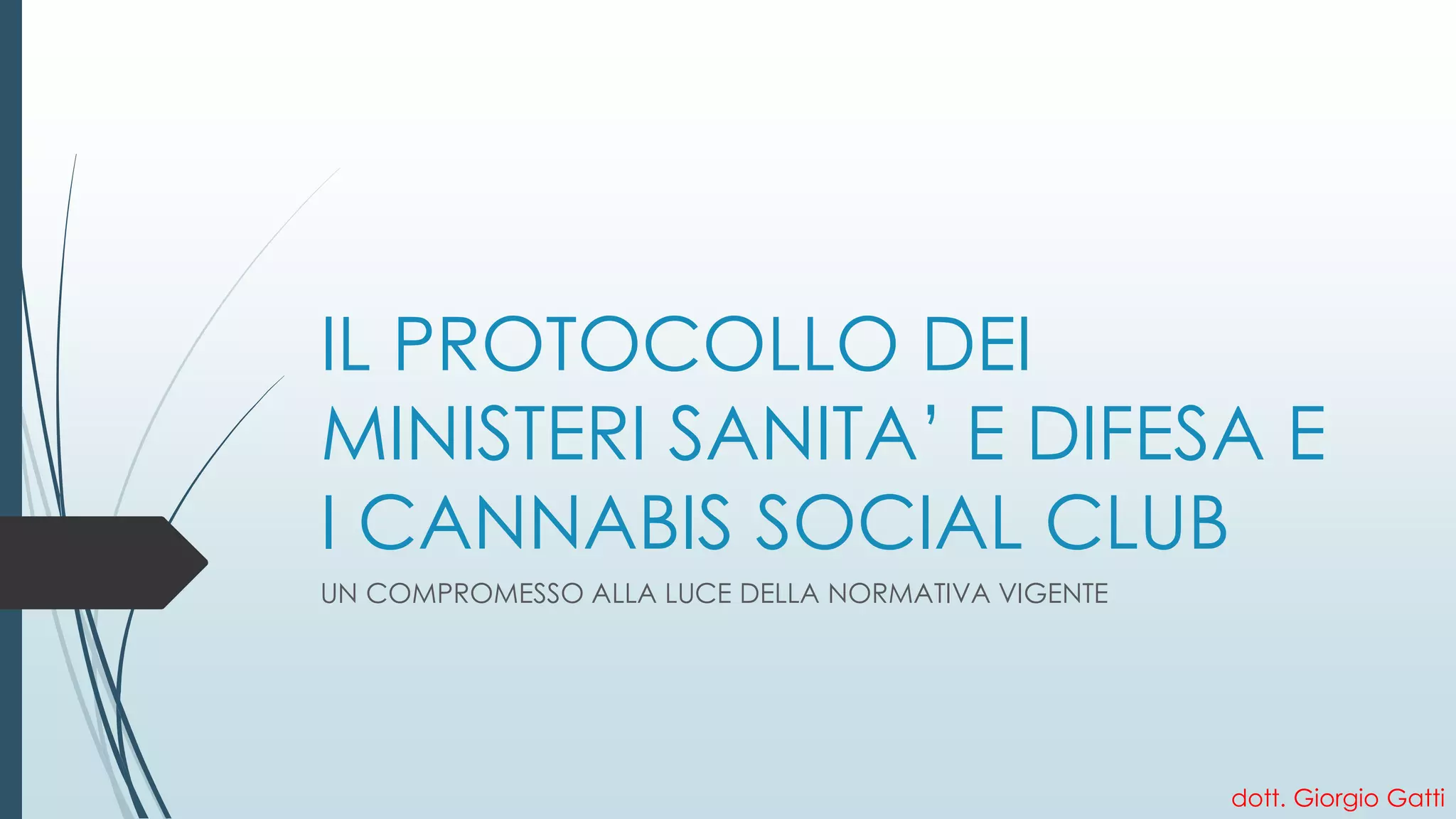 Il documento discute il protocollo firmato dai ministeri della salute e della difesa riguardante i cannabis social club, evidenziando i benefici della legalizzazione della coltivazione limitata di cannabis a scopo sociale. Si propone un progetto pilota per affrontare la coltivazione illecita, promuovendo l'uso collettivo e monitorando i consumi. I cannabis social club sono presentati come strumenti efficaci per la gestione, la produzione e il controllo della qualità della cannabis, mirando a limitare l'accesso al mercato illegale.