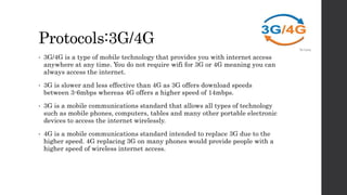 This document discusses various protocols, methods, and services related to technology. It covers 3G/4G and Bluetooth protocols for wireless internet and connectivity. Methods like blogs, email, wikis, and instant messaging are explained. Finally, it defines internet service providers (ISPs) and the worldwide web (WWW), describing how they enable access to websites and online content.
