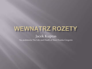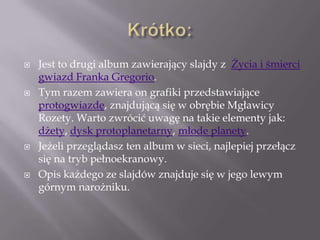 Protogwiazda w Rozecie 1. 2. Krótko:Jest to drugi album zawierający slajdy z Życia i śmierci gwiazd Franka Gregorio.Tym razem zawiera on grafiki przedstawiające protogwiazdę, znajdującą się w obrębie Mgławicy Rozety. Warto zwrócić uwagę na takie elementy jak: dżety, dysk protoplanetarny, młode planety.Jeżeli przeglądasz ten album w sieci, najlepiej przełącz się na tryb pełnoekranowy.Opis każdego ze slajdów znajduje się w jego lewym górnym narożniku.