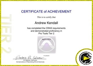 Andrew Kendall has earned a Certificate of Achievement for completing the CRAS requirements and demonstrating proficiency in Pro Tools Tier 2 as of April 9, 2015. The certificate is numbered 3Ufuz0K6Df.