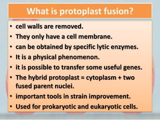 Protoplast fusion technology involves removing the cell walls from cells, leaving only the cell membrane. This allows the fusion of the cell membranes and cytoplasm of two different cell types, transferring genes. There are three main methods of inducing protoplast fusion - mechanical fusion using microtools, chemical fusion using substances like polyethylene glycol, and electrofusion using electric fields. Enzymes like cellulase and pectinase are used to break down plant cell walls, while lysozyme degrades bacterial cell walls. Protoplast fusion has applications in strain improvement for industrial purposes by creating cells with desired properties.