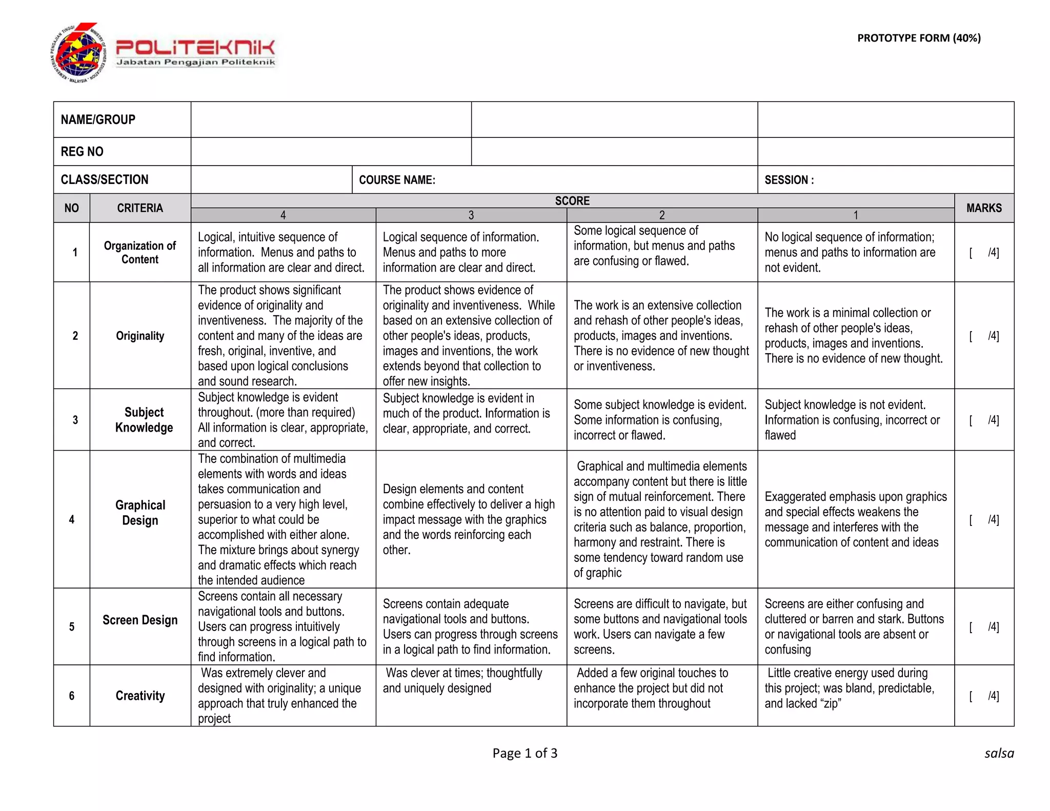 This document contains a prototype evaluation form for assessing a project. The form has 17 criteria that are each scored out of 4 points. The criteria cover areas like organization, originality, subject knowledge, graphical design, screen design, creativity, content, user functionality, administration functionality, and more. The total possible score is 78 points, which constitutes a 30% portion of the overall assessment. The evaluator fills out the form by providing a score for each criteria based on the level of achievement or quality demonstrated by the project.