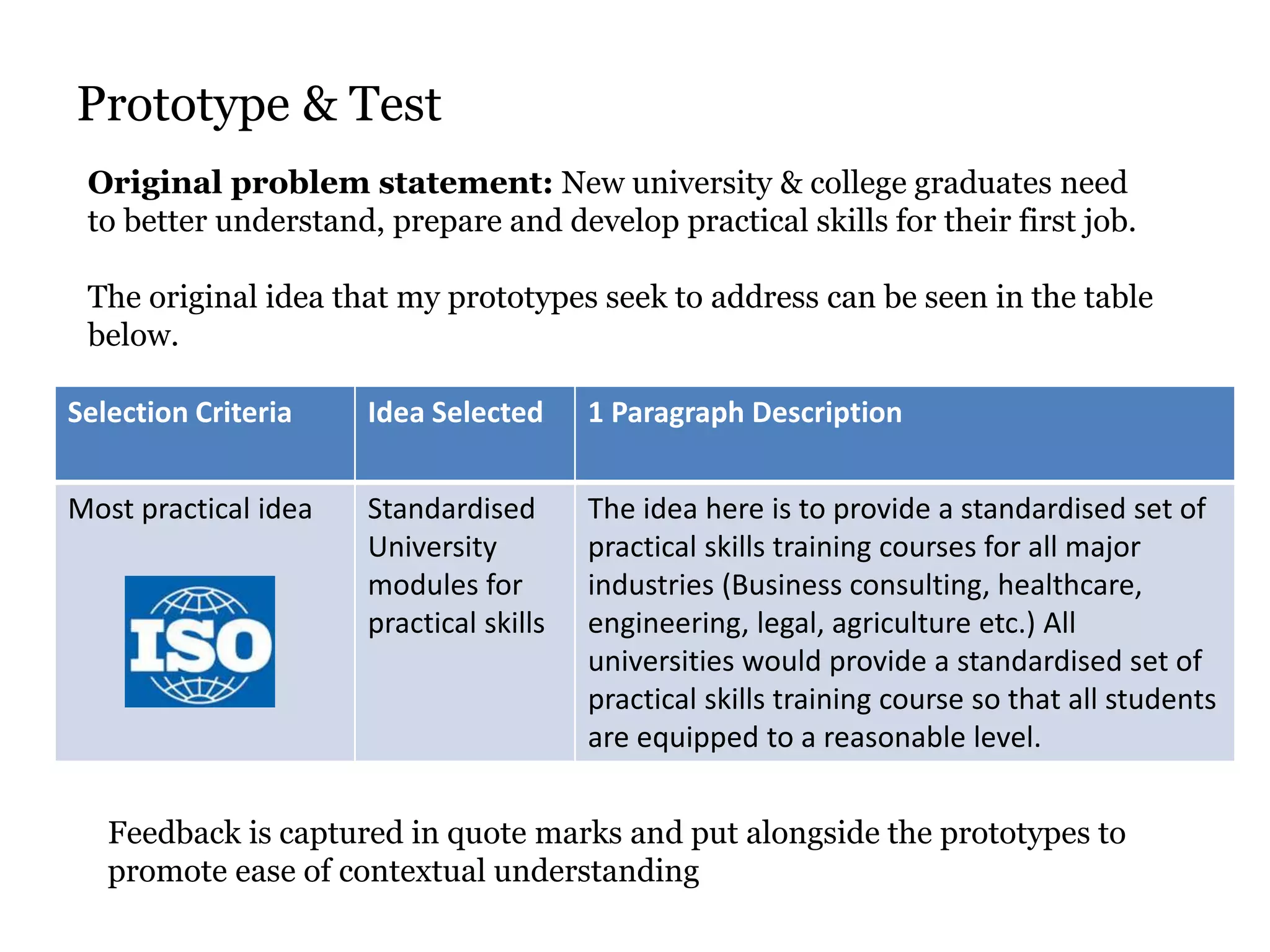 The document describes a selection process for ideas to address the problem of new university graduates needing better practical skills preparation for their first job. The most practical idea selected was to provide standardized practical skills training modules across all major industries through universities. A prototype of a practical skills app and a practical skills development portal were created and feedback was gathered. Feedback noted positives like gamification elements but also issues like confusing layouts. Next steps would involve reworking the prototypes based on the feedback and doing additional testing.