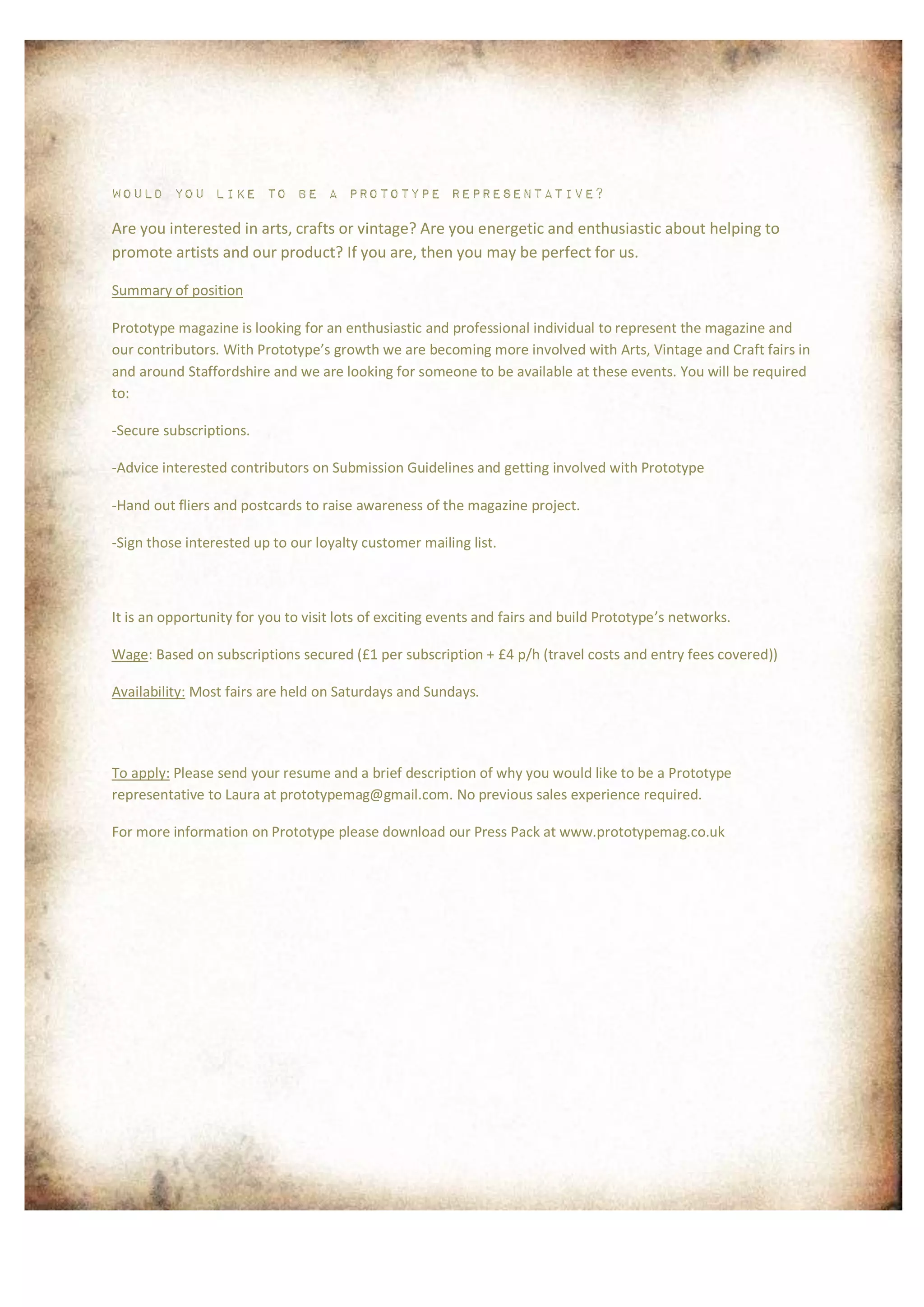 This document is advertising for a representative position for Prototype magazine to promote the magazine and artists at arts, crafts, and vintage fairs. The representative would be responsible for securing magazine subscriptions, advising artists, distributing promotional materials, and signing people up for the mailing list in exchange for wages based on subscriptions and an hourly rate. Applicants should email their resume and interest statement to the provided email address.
