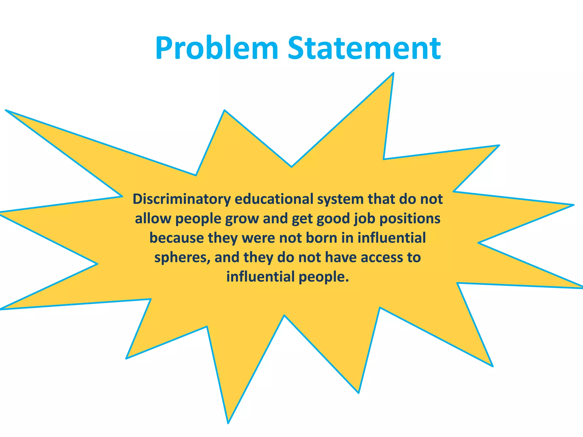 The document proposes solutions to address discriminatory educational systems. It discusses two main ideas: 1) Removing names from resumes so jobs are evaluated based only on merits and qualifications rather than background. Testing found this could still allow deducing social groups from universities. 2) Raising societal awareness of discrimination through widespread messaging to make people more empathic. Testing found this could be effective long-term if the messaging campaign targets all ages and is sustained long-term. The document reports back on initial testing of these ideas with one person and discusses improving the solutions.