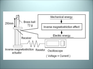 This document discusses the design and testing of a Giant Magnetostriction Electric power Generator (GMEG) that converts vibration energy into electricity. The GMEG uses a Terfenol-D giant magnetostrictive material which changes shape under magnetic fields. Experimental results showed the GMEG could generate over 100W of power from a dropped metal ball and that output voltage increased with an applied preload of 8MPa to the Terfenol-D. A vibration deflector was also designed to redirect vibrations to the GMEG from different angles.