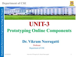 The document outlines a presentation on prototyping online components and APIs in the context of the Internet of Things, delivered by Dr. Vikram Neerugatti at Chadalawada Ramanamma Engineering College. It includes topics such as getting started with APIs, writing new APIs, real-time reactions, and various protocols like MQTT and XMPP. The content emphasizes the implementation and communication between clients and servers, as well as legal considerations in the creation of APIs.