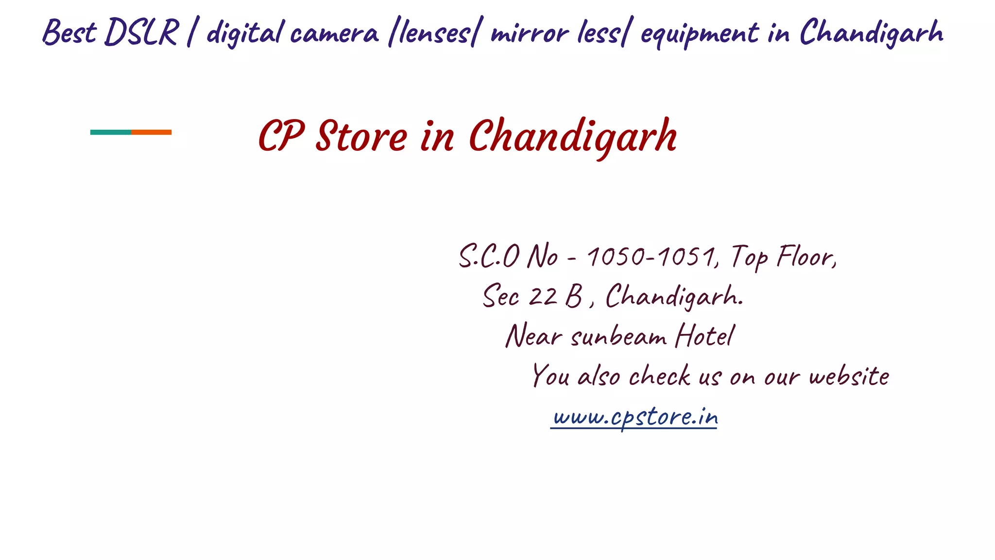 CP Store in Chandigarh offers a wide variety of professional cameras and accessories, including top brands like Sony. Notable products include the Sony Alpha 7 III and A7C mirrorless cameras, as well as lenses such as the FE 70-200mm f/2.8 and FE 16-35mm f/2.8. For inquiries and purchases, customers can visit the store or contact them via the provided phone numbers.