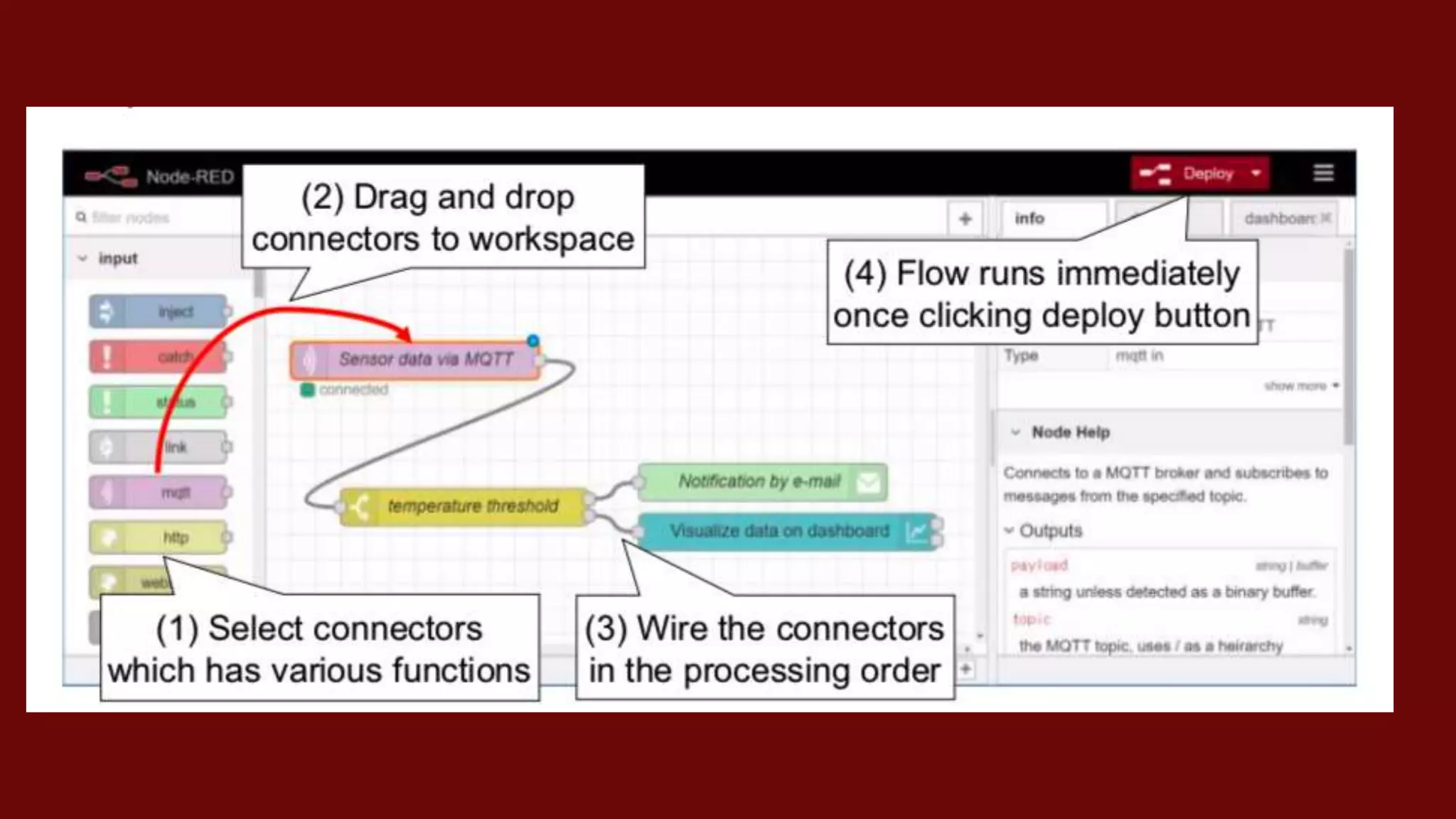 Node-RED is a flow-based programming tool for wiring together hardware devices, APIs and online services that was created by IBM in 2013 and is now a founding project of the JS Foundation. It uses a browser-based flow editor to help develop IoT applications and can be used both at the edge on devices like Raspberry Pi as well as in the cloud. Node-RED features a wide range of nodes that allow it to interface with services, protocols, and devices.