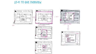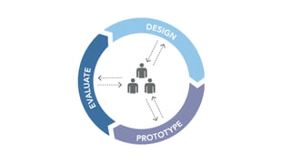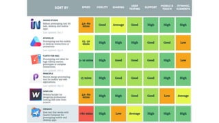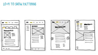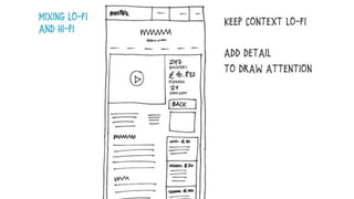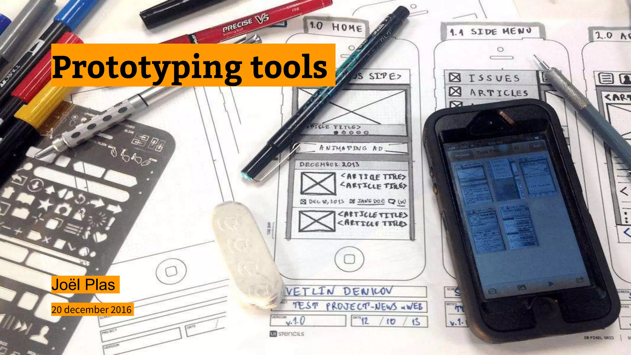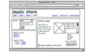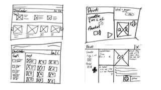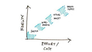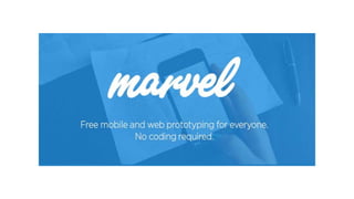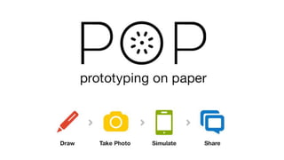 The document discusses prototyping tools and methods for testing designs early in the development process. It recommends starting with paper prototyping to test initial ideas and layouts. The next step is wireframing using free online tools to layout content hierarchy and flow. Visual mockups are then created using design tools to test the design. Prototypes should then be made as realistic as possible to test usability, experience and content. Testing prototypes with users early is better than waiting until late in the process with many users. The overall goal is to test designs quickly through various prototyping methods.