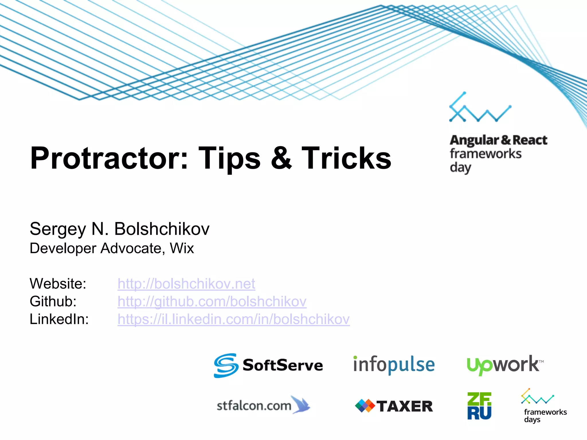 The document provides a comprehensive guide for developers on using Protractor for end-to-end testing, covering common problems and solutions, best practices, and tips for improving test maintainability and performance. Key issues addressed include managing window sizes, handling changes in HTML structure, and strategies to reduce complexity in test structure. Protractor helpers and custom matchers are also introduced to streamline testing processes.