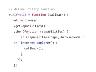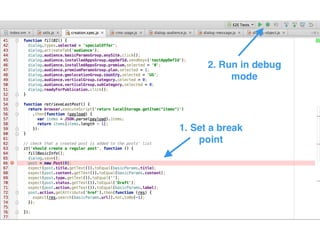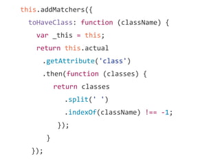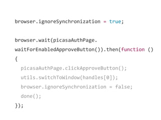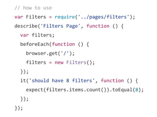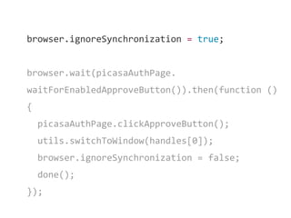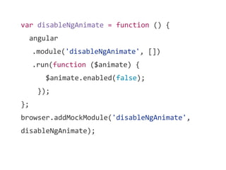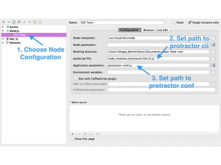 The document discusses best practices, tips, performance, and debugging strategies for Protractor, an end-to-end testing framework for AngularJS applications. It addresses common problems like unknown window sizes, fragile tests due to small HTML changes, and long test run times. Solutions include setting the window size before tests, using page objects to abstract the HTML, enabling sharding to run tests in parallel, and integrating with IDEs for debugging. The tips are from Sergey Bolshchikov, a developer advocate and creator of resources for front-end developers.