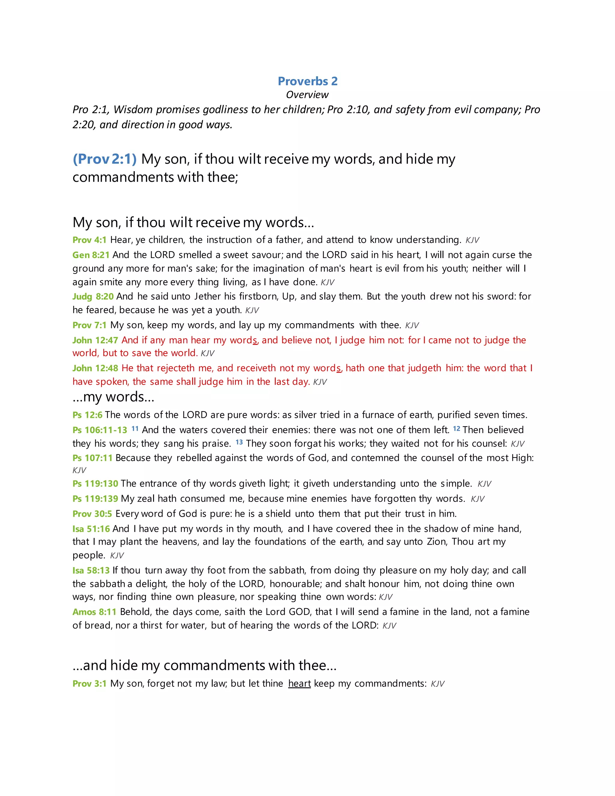 The document provides an overview of Proverbs 2 which discusses how wisdom promises godliness, safety from evil, and direction in good ways to those who receive God's words, hide His commandments, incline their ear to wisdom, and apply their heart to understanding. It then provides multiple Bible verses related to each of these concepts to further explain and support the message of Proverbs 2.