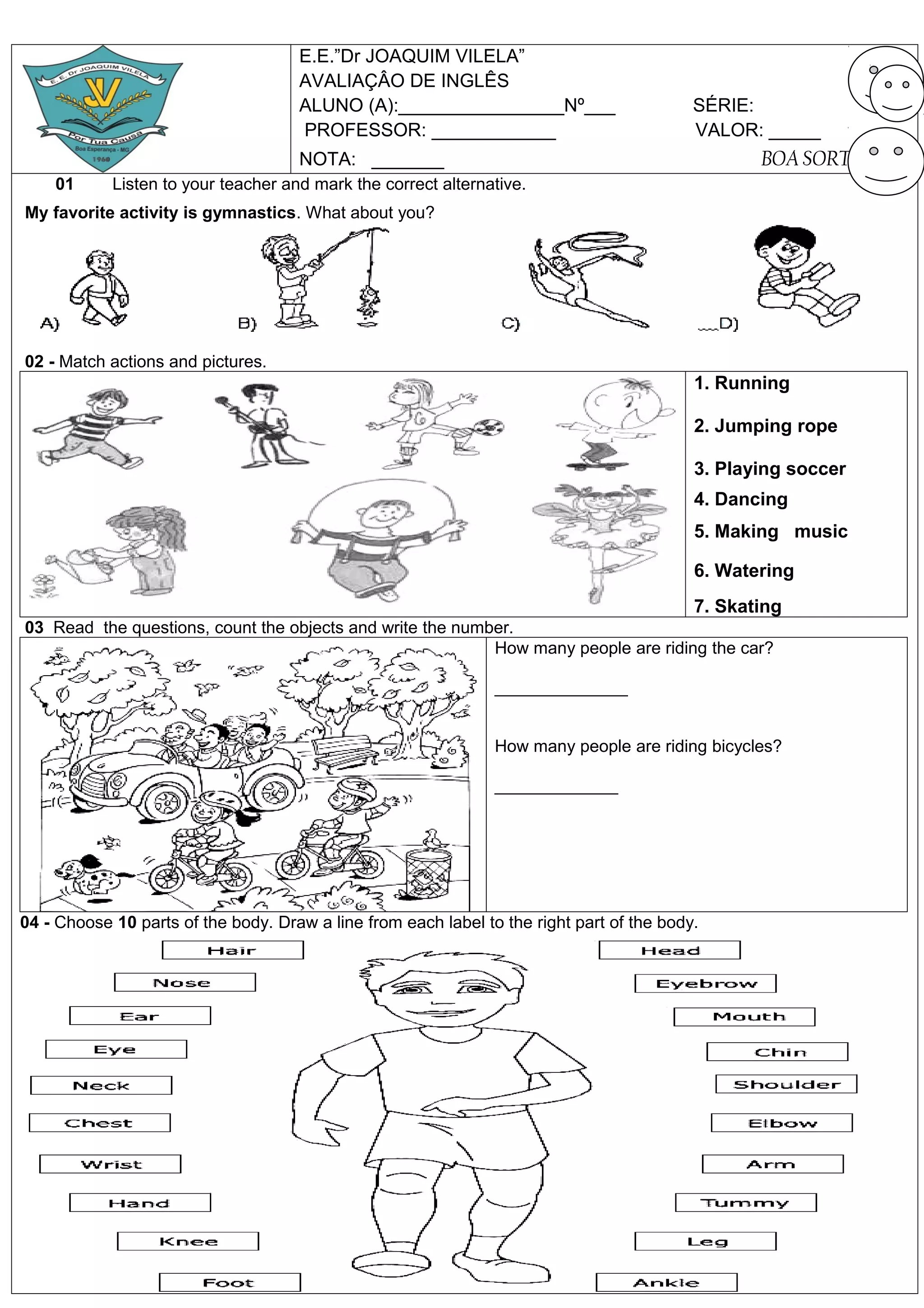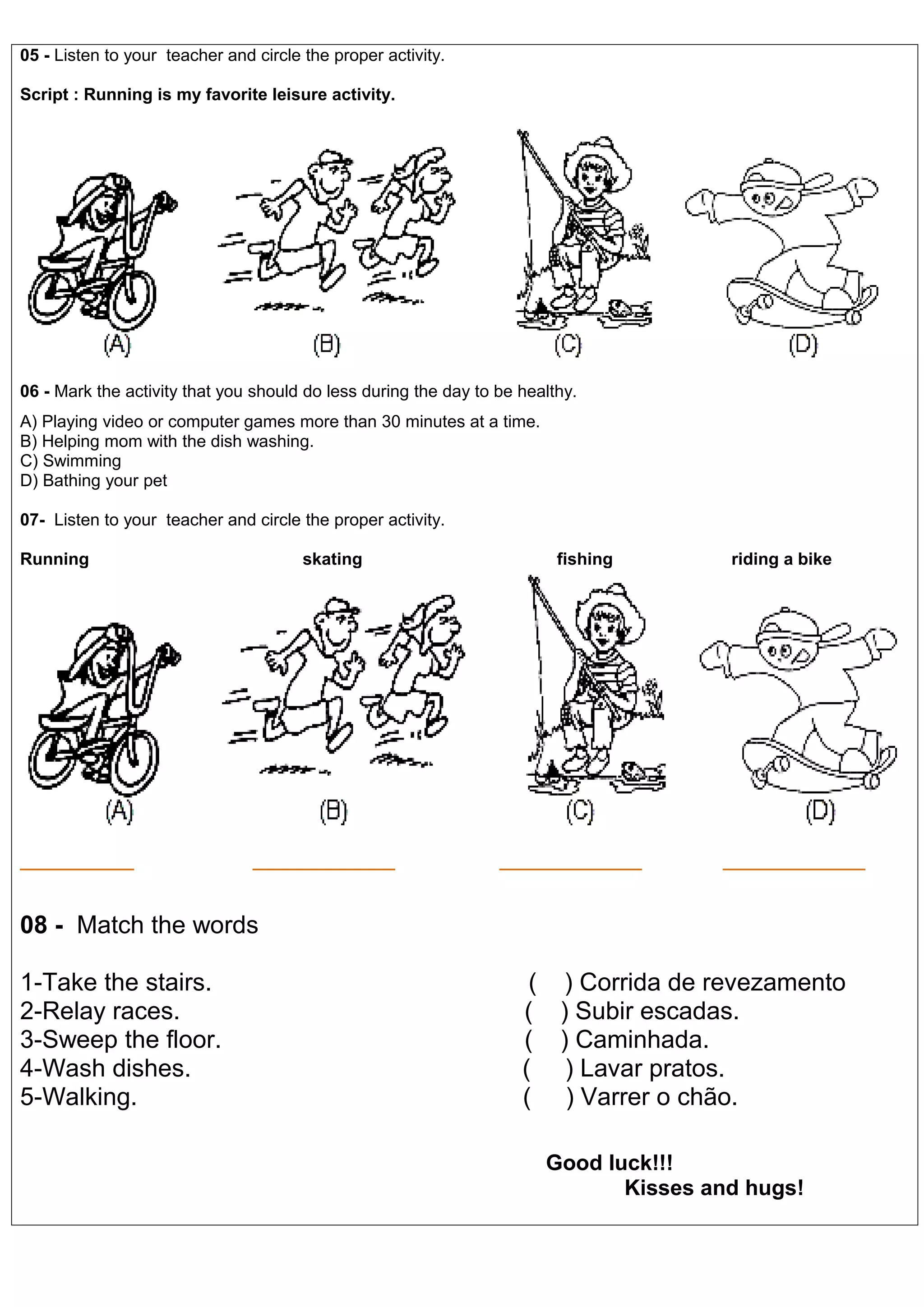 This document is an English assessment for a student containing various exercises to test listening comprehension and matching activities related to parts of the body, daily activities, and sports. It includes questions about counting objects in pictures, choosing healthy activities, circling the proper word to match a script, and matching words to their Portuguese translations. The assessment provides the student with encouragement at the end by wishing them good luck and sending kisses and hugs.