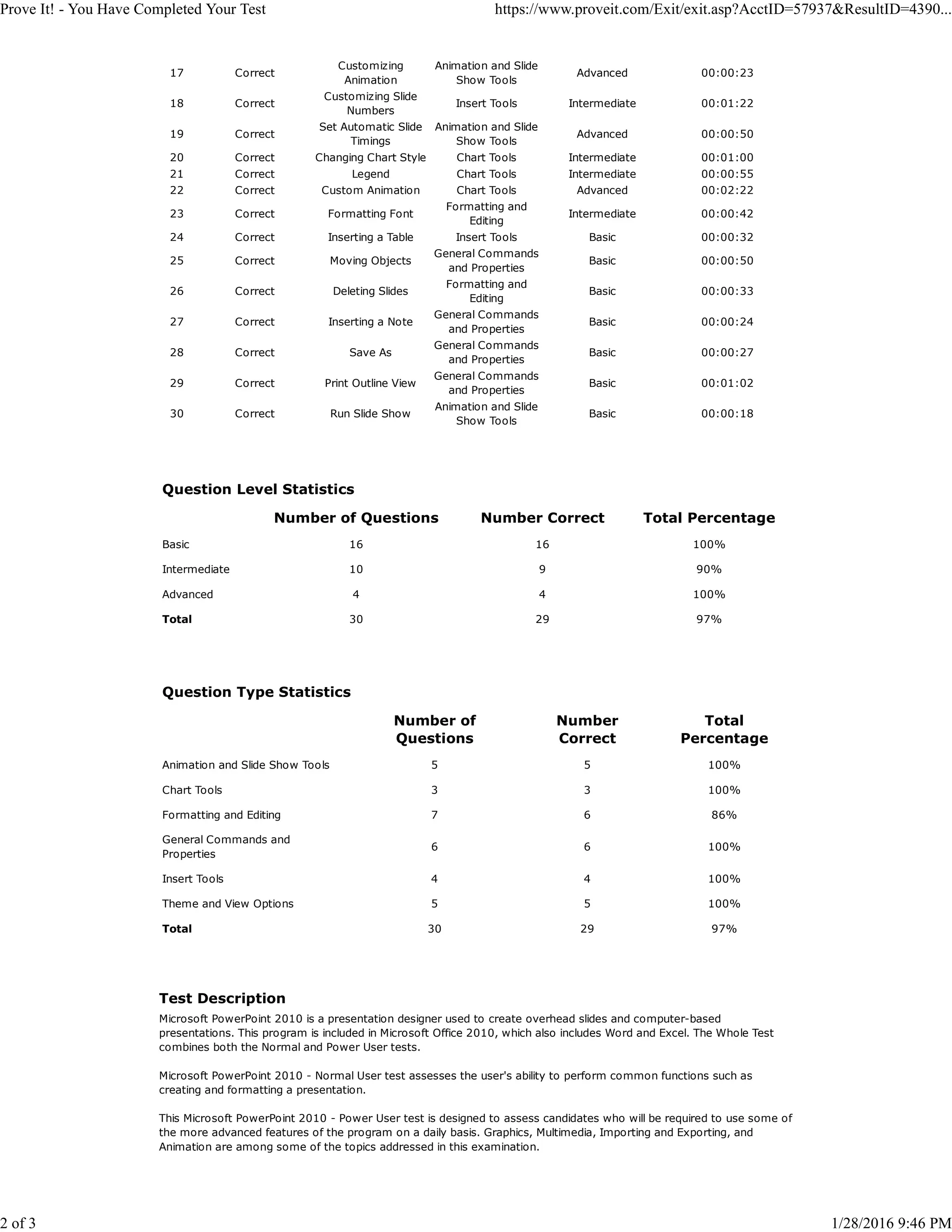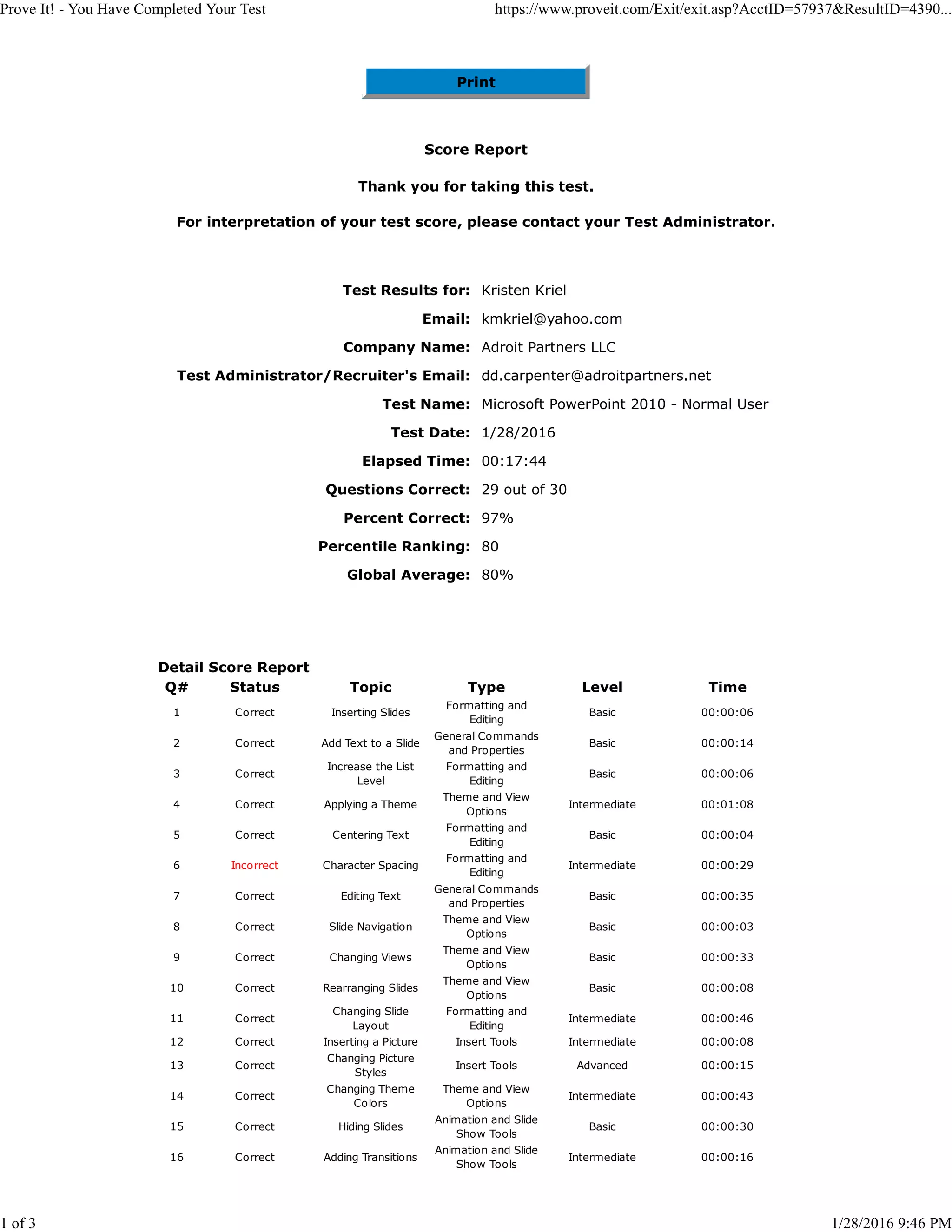 Kristen Kriel took a Microsoft PowerPoint 2010 - Normal User test and scored 97%, answering 29 out of 30 questions correctly. Her score was above the global average of 80%. The majority of her correct answers were for basic-level questions, though she also answered most intermediate questions correctly and all advanced questions. The test assessed skills for common PowerPoint tasks like creating and formatting presentations.