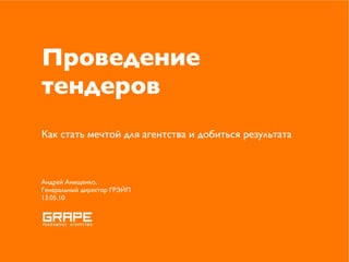 Документ обсуждает проведение тендеров и проблемы, с которыми сталкиваются агентства при привлечении клиентов. Успех в тендерах зависит от правильного управления ресурсами, интереса к предложению и соблюдения внутренних таймингов. Основная задача агентств - повысить процент побед и минимизировать затраты на неэффективные пресейлы.