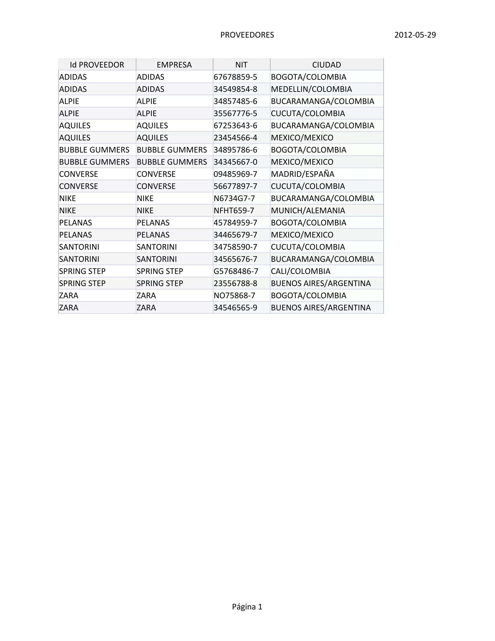 The document contains a list of suppliers with their company name, tax ID, city and country. It includes contact information for each supplier with their last name, first name, email and product ID. There are listings for 14 suppliers including brands like Adidas, Nike, and Zara located across Colombia, Mexico, Spain and Germany.