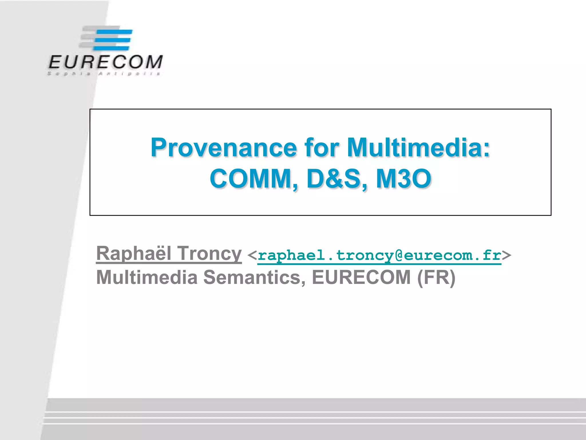 The document discusses provenance in multimedia semantics, focusing on tagging approaches and semantic annotation of multimedia objects using MPEG-7 standards. It highlights the complexity of multimedia content, the need for patterns and ontologies for effective information exchange, and several design patterns for decomposition and annotation. Additionally, it outlines various provenance vocabularies and emphasizes the importance of formalized contexts for multimedia interpretation.