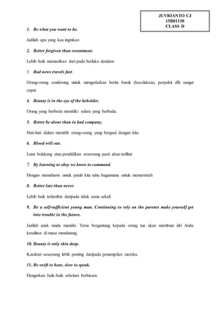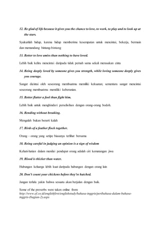 Kumpulan peribahasa di atas memberikan nasihat tentang bagaimana bersikap dan berinteraksi dengan orang lain, termasuk menjadi diri sendiri, memaafkan daripada membenci, memilih teman, menghargai keluarga, serta pentingnya mendengarkan dan belajar sebelum berbicara. Peribahasa-peribahasa tersebut juga menekankan pentingnya kemandirian, kehati-hatian dalam menilai orang lain, serta tidak boleh ter