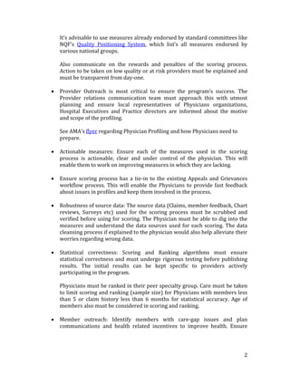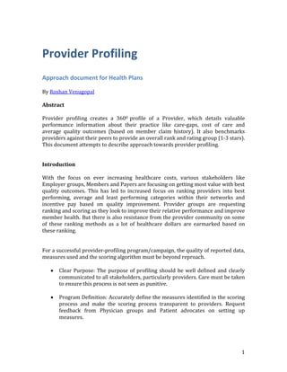 The document outlines a provider profiling approach for health plans, detailing methods to create comprehensive performance profiles of healthcare providers based on metrics like care gaps and quality outcomes. It emphasizes the importance of transparent scoring processes, accurate data usage, and continuous improvement to engage providers and enhance healthcare delivery. Challenges such as patient assignment and communication are also highlighted, alongside references to various guiding principles and studies in the field.