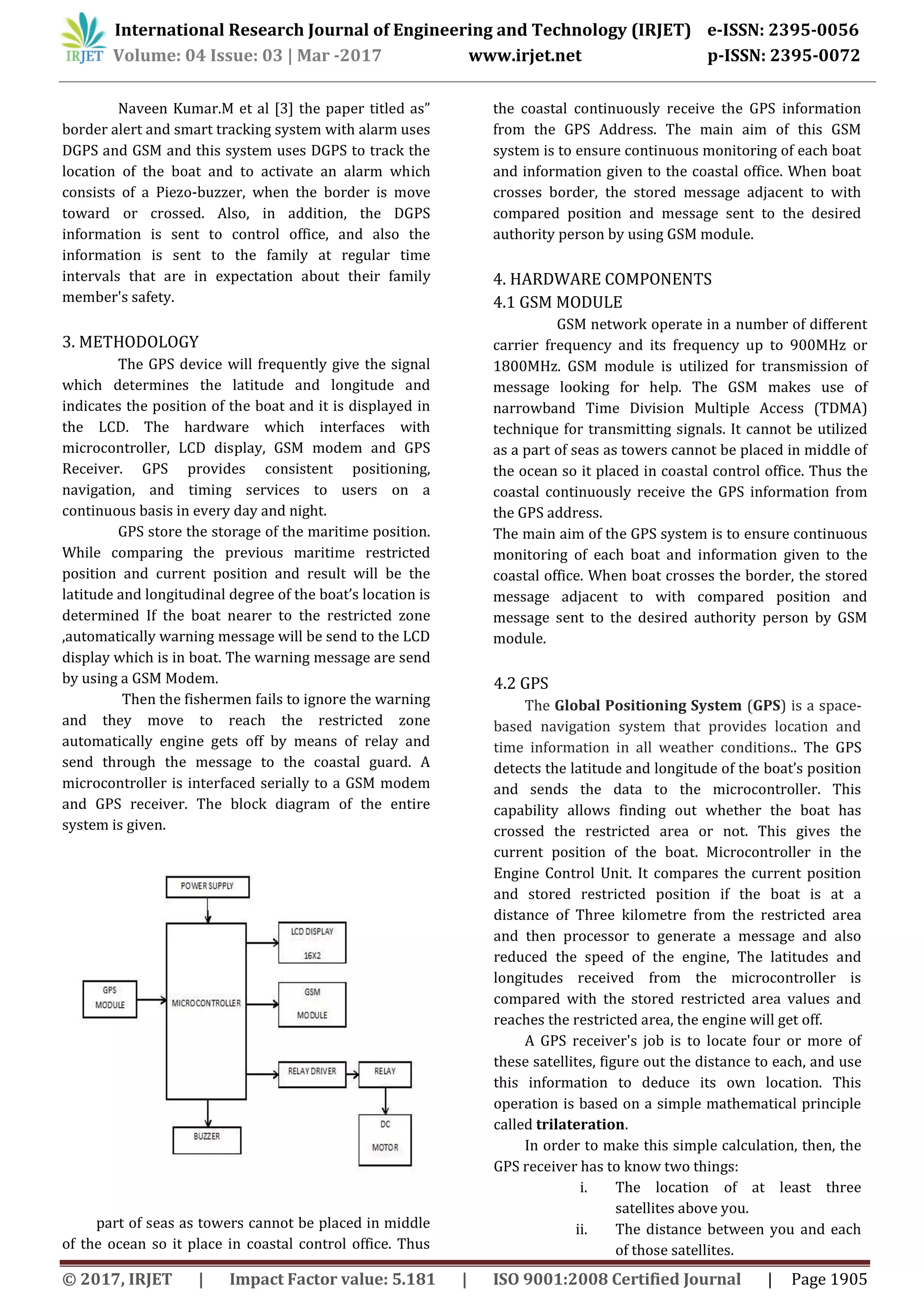 This document describes a border alert system for fishermen using GPS and GSM technology. The system tracks the location of boats using GPS and alerts fishermen with a warning message on an LCD display when they near the border. If the fishermen continue past the border, the system will automatically stop the boat's engine using a relay. The goal is to prevent Indian fishermen from accidentally crossing into Sri Lankan waters and protect their safety. The system components include a GPS module to track location, GSM module to send alerts and location data, microcontroller for processing, engine control unit to stop the engine, and power supply. It provides a low-cost solution to ensure fishermen do not cross maritime borders.