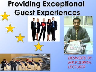 Providing Exceptional Guest Experiences document discusses 7 keys to providing a 4-star guest experience: 1) Extremely proficient guest service, 2) Cross-selling products, 3) Facility cleanliness, 4) Activities, 5) Memorable dining, 6) Branding and atmosphere, 7) Updated accommodations. It emphasizes training employees, cleanliness, activities and amenities, themed dining experiences, facility branding, and regular room renovations. Additional tips include using contests, local partnerships, and press releases for exposure, and seeking free tourism resources.