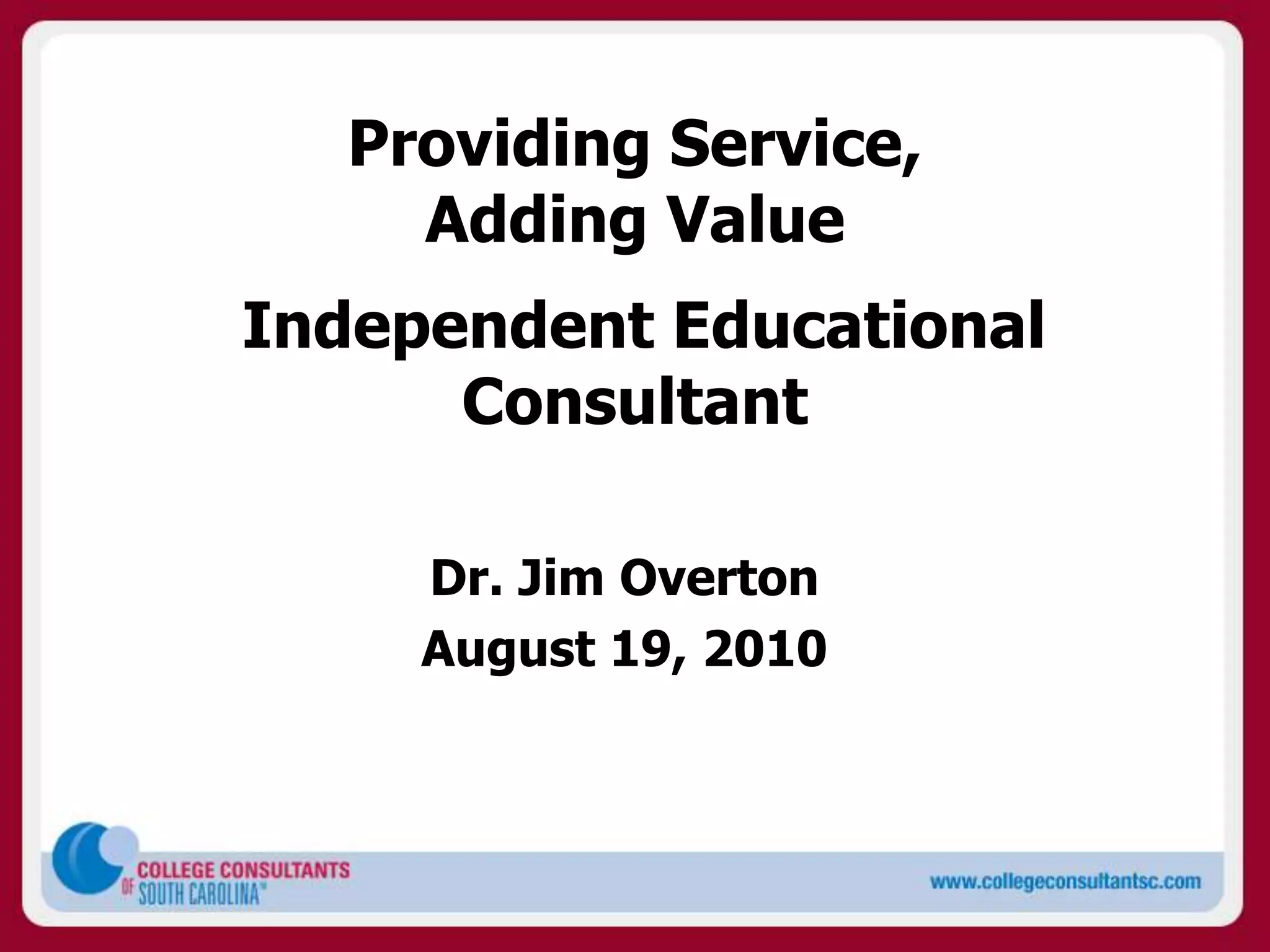 The document discusses how the college application process has become more complex over time with more deadlines, complicated applications, and greater challenges for admission and financial aid. It then provides statistics showing increases in tuition rates for colleges in South Carolina from 2009-2010 to 2010-2011, with increases ranging from 3.5% to 14.75%. The rest of the document introduces Dr. Jim Overton as an independent educational consultant who helps students individually with the college application process by providing services like assisting with applications, editing essays, helping students find target schools, and advising them on financial aid and scholarships.