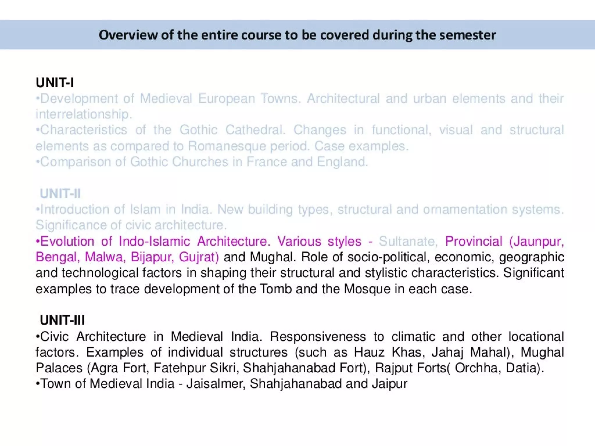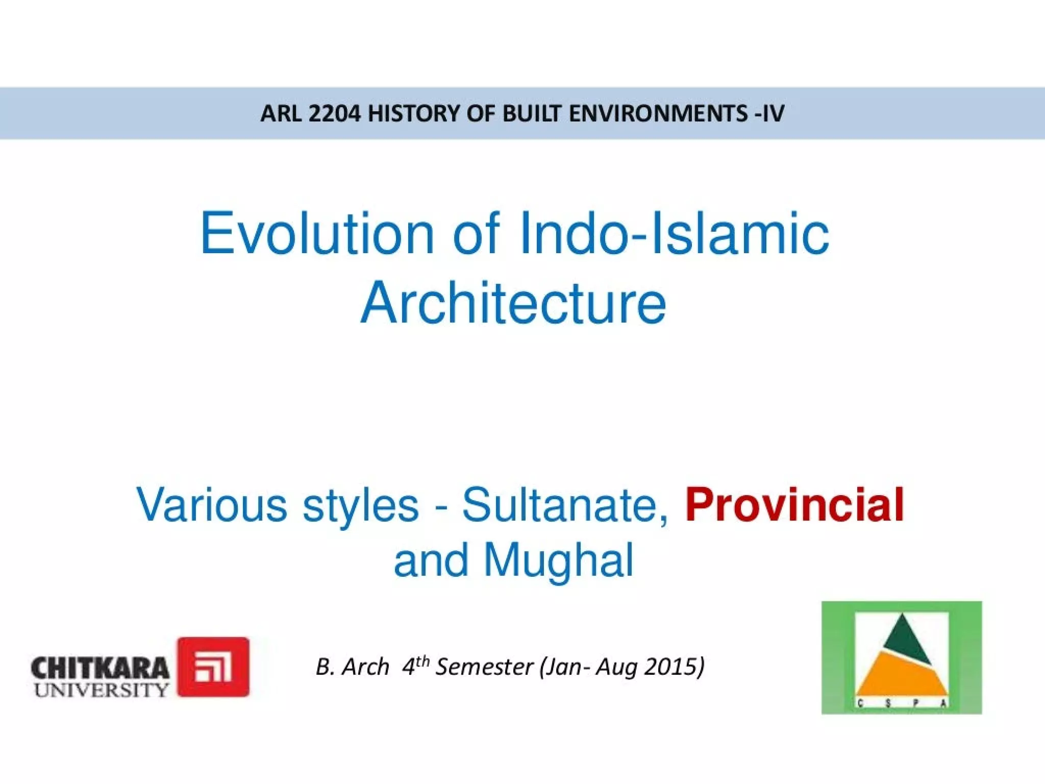 The document provides an overview of the Provincial Style of Indo-Islamic Architecture. It discusses several regional architectural styles that developed in different provinces, including Bengal, Gujarat, Jaunpur, and others. Key characteristics of each style are outlined, with important buildings like the Jami Masjid of Ahmedabad and Champanir described in detail. The Jaunpur style is highlighted, with descriptions of features like arched pylons and the Atala Masjid and Jami Masjid discussed as representative examples.