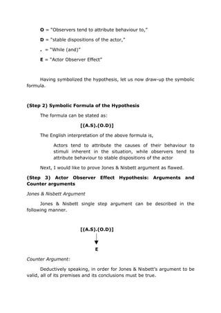 The document argues that psychological hypotheses should first be evaluated for validity through logical reasoning before conducting research. It critiques the 'actor-observer effect' hypothesis by Jones & Nisbett for assuming fixed attribution categories and presents counterarguments demonstrating the possibility of multiple attributions. The author emphasizes that flawed hypotheses are a liability and suggests that logical analysis should precede empirical research.