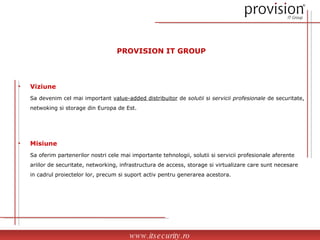 Provision IT Group își propune să devină un distribuitor de soluții și servicii profesionale în domeniul securității, rețelisticii și stocării în Europa de Est. Compania colaborează cu integratori și reselleri pentru a oferi produse din securitatea informației și networking, promovând tehnologii variate de securitate, gestionare a identității și accesului, precum și soluții de protecție a datelor. Cu un portofoliu extins, Provision IT Group se concentrează pe inovație și suport activ pentru partenerii săi în proiectele IT.