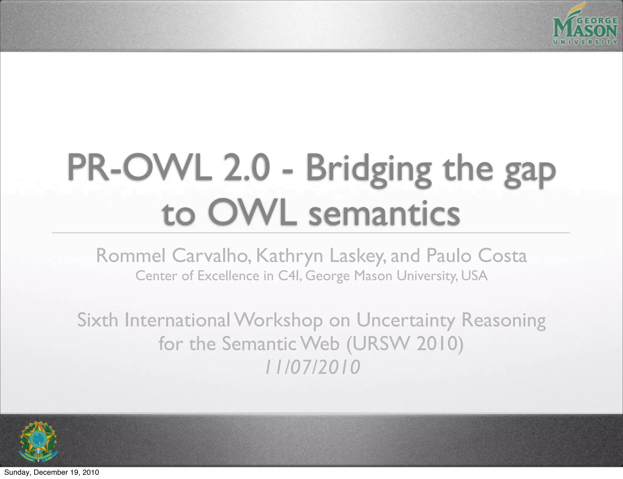 The document discusses bridging the gap between PR-OWL and OWL semantics. It introduces probabilistic ontologies which include types of entities, properties, relationships, processes/events, statistical regularities, and uncertainty. It describes how the mapping between PR-OWL and OWL is currently incomplete and proposes solutions to better represent binary and n-ary relations between concepts.