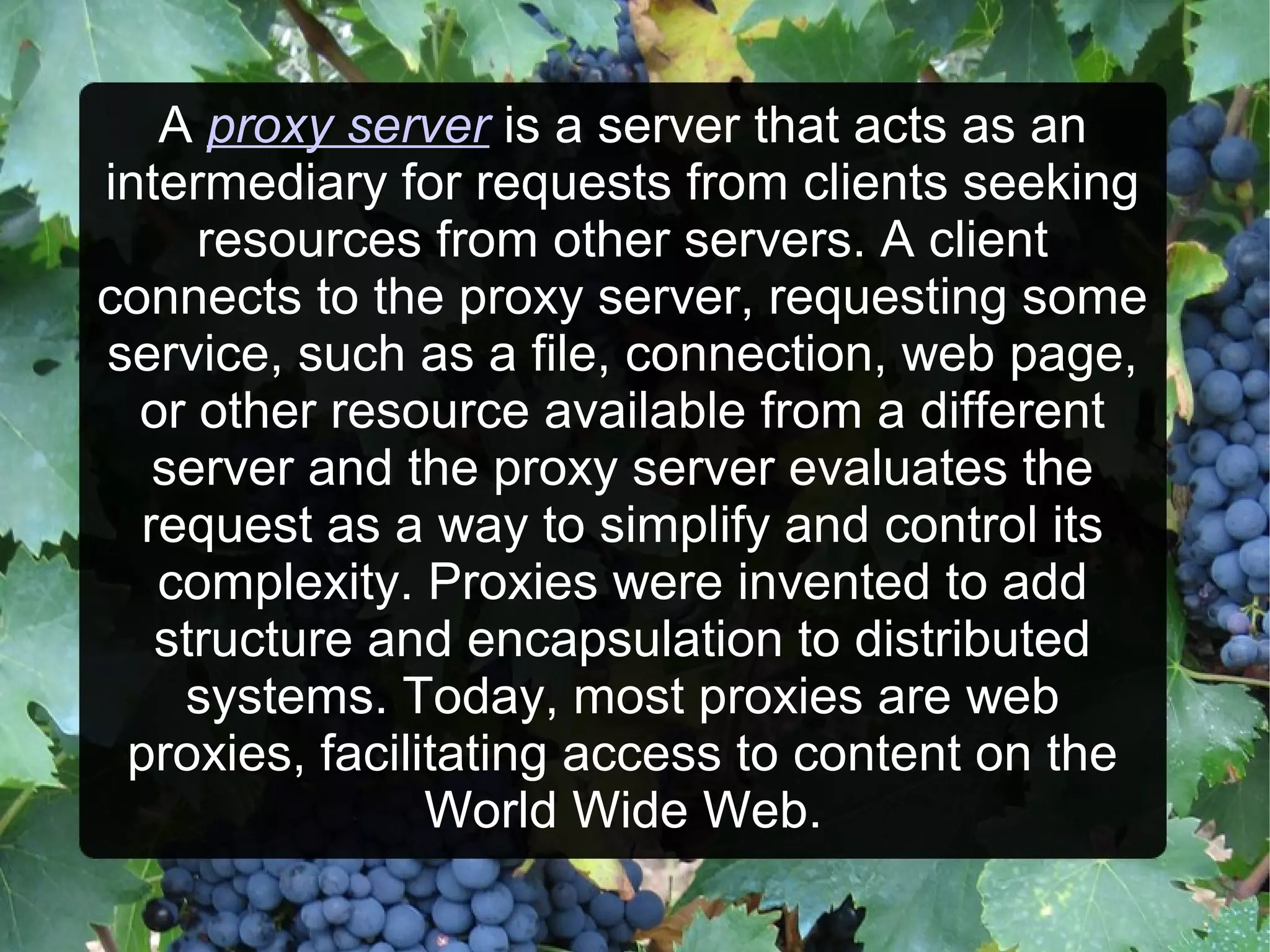 A proxy server acts as an intermediary for clients seeking resources from other servers, simplifying and controlling requests. Various types of proxies include forward, reverse, and open proxies, each serving different purposes such as retrieving resources or preserving anonymity. Additionally, specialized proxies like Facebook and YouTube proxies help users bypass restrictions on specific platforms.
