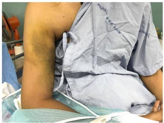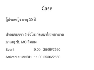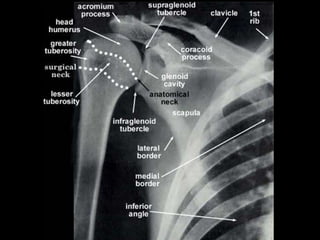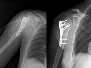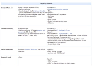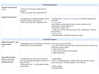 This document summarizes the key points about a proximal humerus fracture case. It describes a 30-year-old female patient who was brought to the emergency room after falling off her motorcycle. Her injuries included a proximal humerus fracture on her right arm. The document reviews the epidemiology, anatomy, classification, evaluation, treatment options and rehabilitation for proximal humerus fractures. It provides details on the patient's case, management in the emergency room, and anticipated treatment plan.