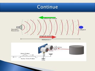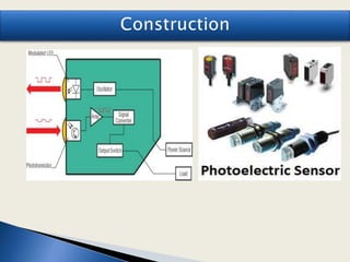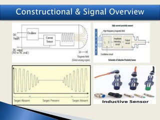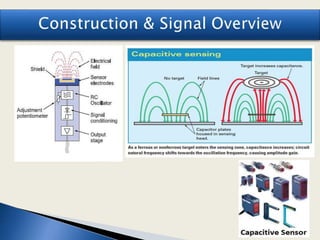 The document discusses various types of proximity sensors including inductive, capacitive, photoelectric, magnetic, infrared, and ultrasonic sensors. It provides definitions and descriptions of how each sensor works, including common components, detection ranges, and applications. For example, it explains that inductive sensors detect metallic objects using magnetic fields while capacitive sensors detect non-metallic objects by measuring changes in capacitance. Common applications mentioned include parking sensors, engine sensors, and conveyor systems.