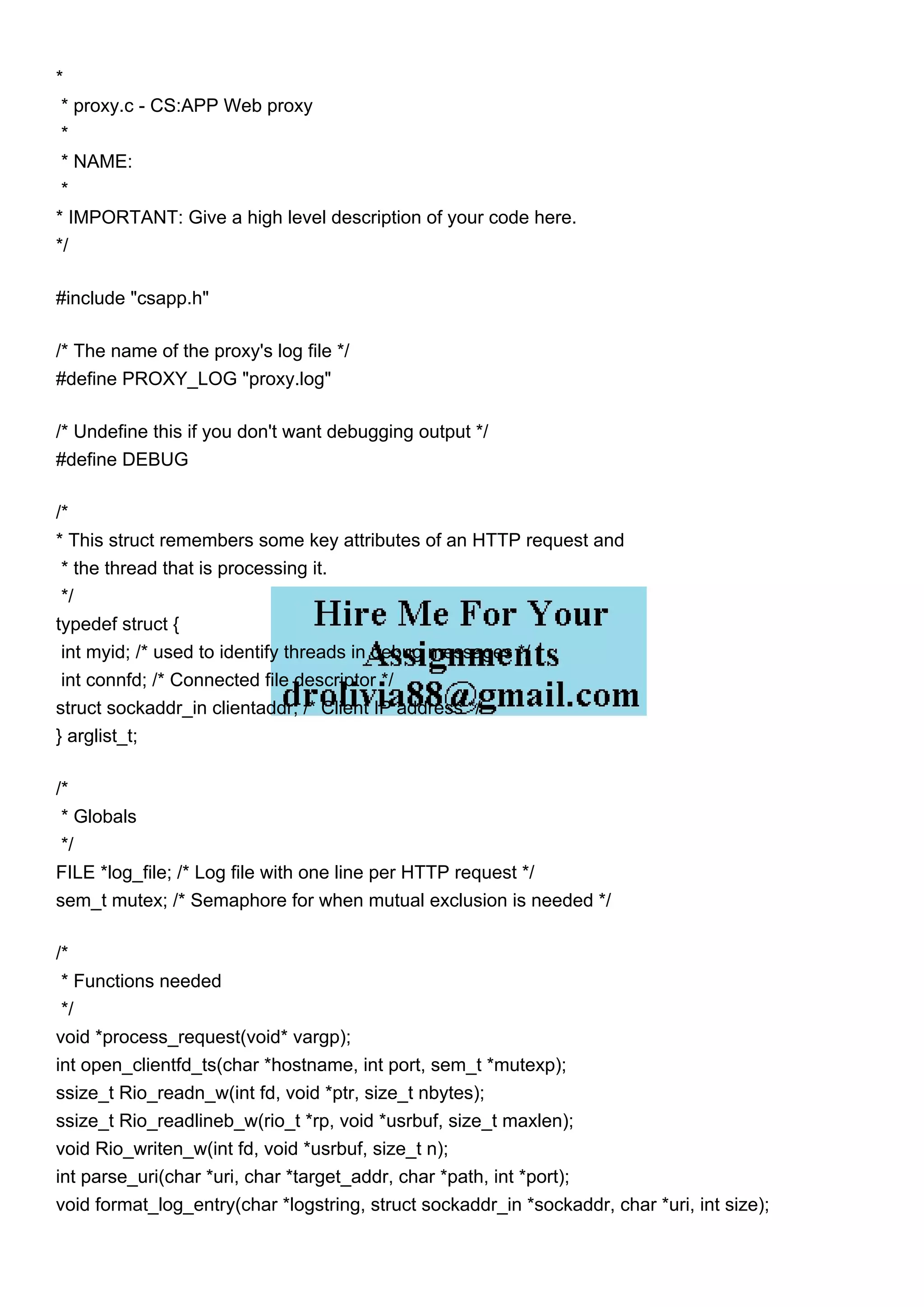 This document describes code for a multi-threaded web proxy. The proxy receives HTTP requests from clients, forwards the requests to the intended web server, receives the response, and sends the response back to the client. Each client request is handled by a separate thread. Key functions include processing each request in a thread, connecting to the destination web server, parsing the URI to extract host/path/port, and logging each request.