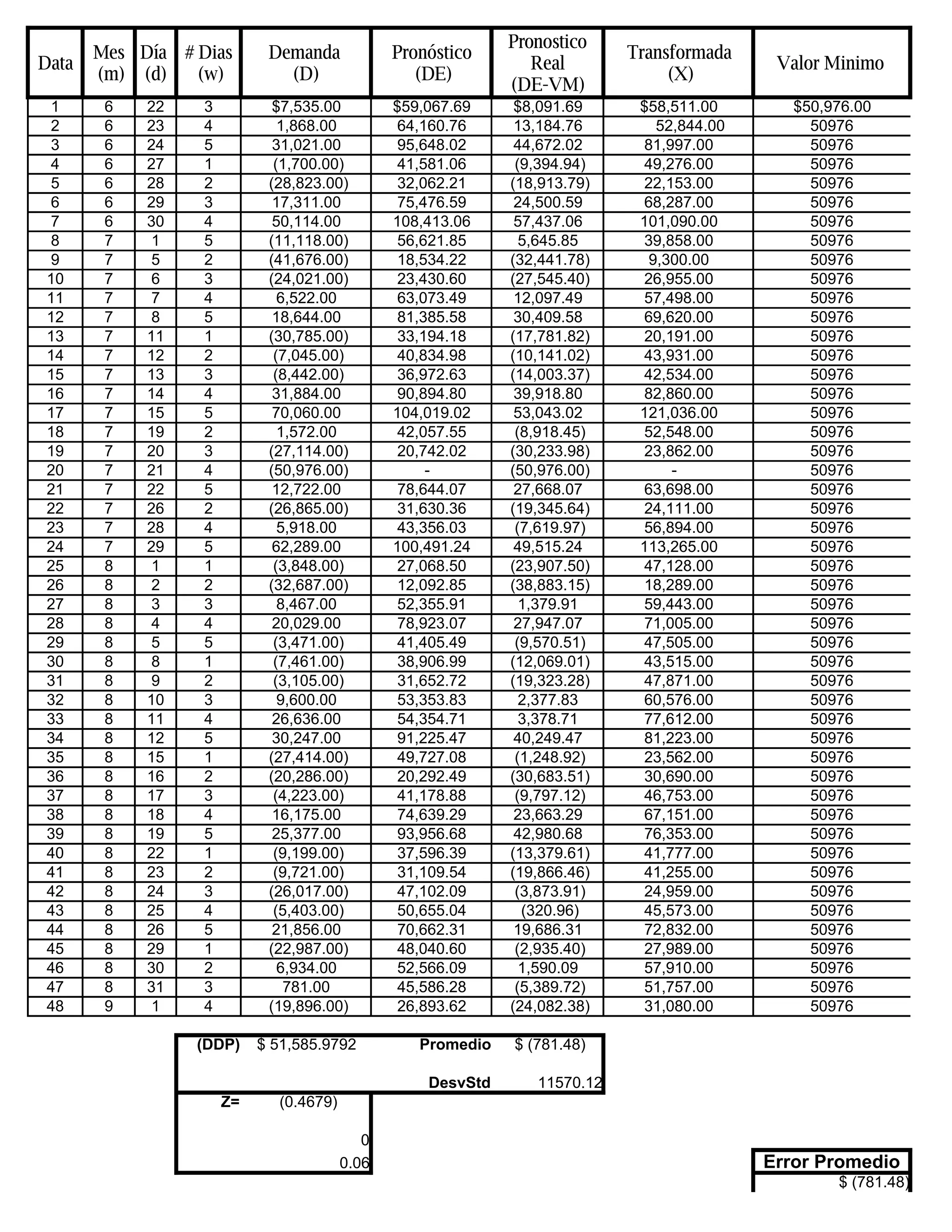 The document appears to be a table containing forecasting data over 48 periods including dates, demand values, forecast values, minimum values, and error calculations. It includes a summary stating the average error was $781.48 with a standard deviation of 11,570.12 and a z-score of 0.4679.