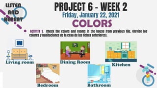 The document outlines activities for an educational project focused on colors and rooms in a house. It includes instructions for listening, repeating vocabulary related to various rooms, and drawing pictures based on sentences describing room colors. The activities are aimed at enhancing students' understanding of the topic and engaging them in a creative way.
