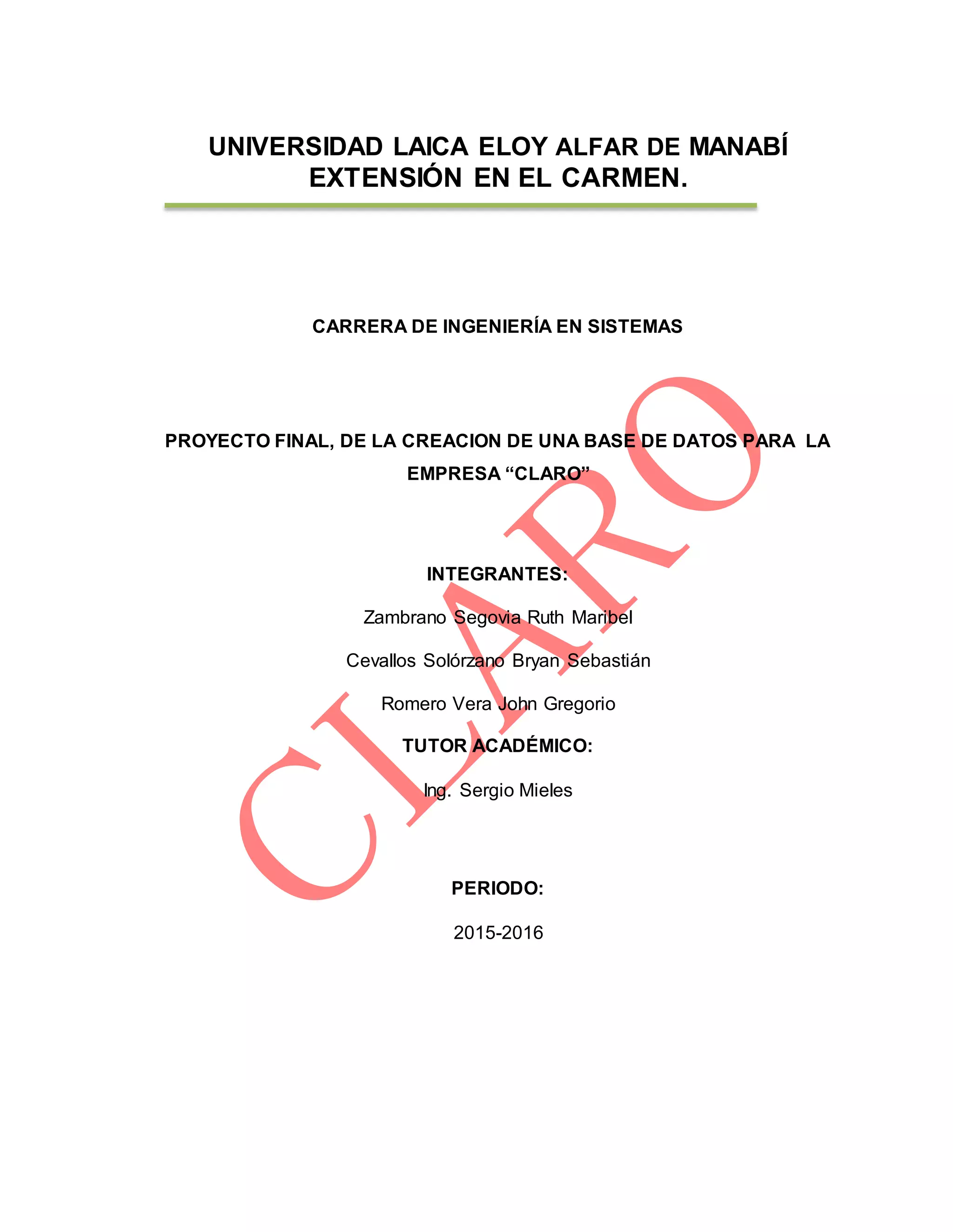 Este documento presenta el proyecto final de la creación de una base de datos para la empresa "CLARO" realizado por tres estudiantes como parte de sus estudios de Ingeniería en Sistemas en la Universidad Laica Eloy Alfaro de Manabí. El proyecto incluye la introducción, objetivos, marco teórico, desarrollo y conclusión de la base de datos creada en MySQL para la empresa.