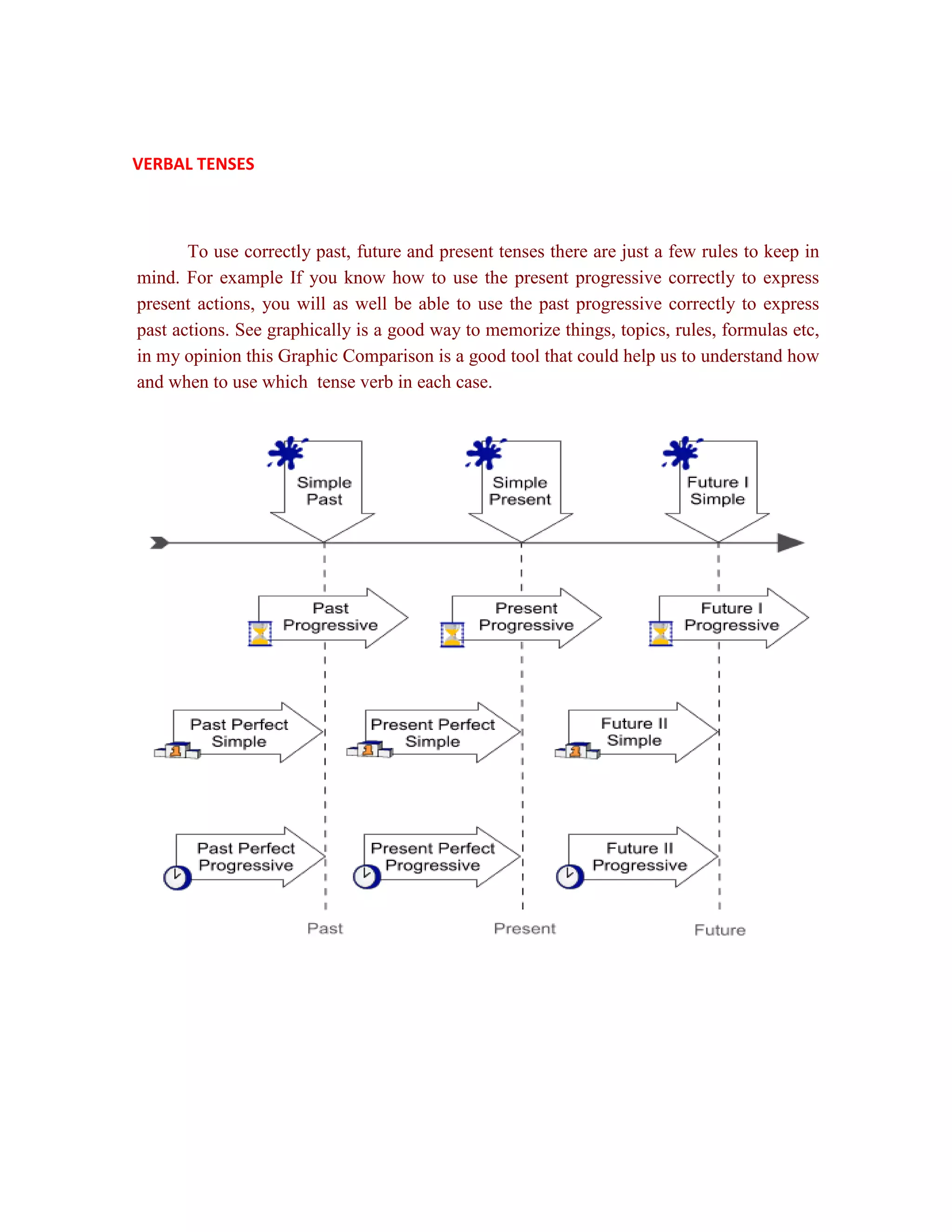 The document provides an overview and examples of how to use different verb tenses in English, including past, present, and future tenses. It includes a graphic comparing the simple, progressive, and perfect verb tenses. Examples are provided for regular and irregular verbs in the affirmative and negative form for each tense. The tenses covered include simple past, present, and future, past and present progressive, past perfect, present perfect, and future perfect.