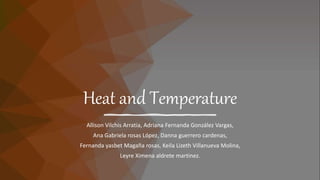 Heat is a form of energy that flows from hotter objects to cooler objects and can be produced through bending, chemical reactions, or collisions. Temperature is a measure of how hot or cold an object is on a given scale. Heat travels through conduction, convection, or radiation. While heat is the transfer of thermal energy, temperature is a property relating to average molecular kinetic energy. Materials that allow rapid heat transfer are conductors, while insulators do not allow easy heat passage. Heat is found in everyday life through cooking, warming, engines, and generating energy.