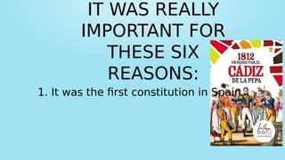 The first constitution in Spain was called La Pepa and was signed on March 19th, 1812 in Cádiz. It was an important and modern document that established equality and freedom for all, organized Spain as a constitutional monarchy with a king and elected ministers, and granted men the right to vote at age 18. This was a milestone as the first constitution for Spain.