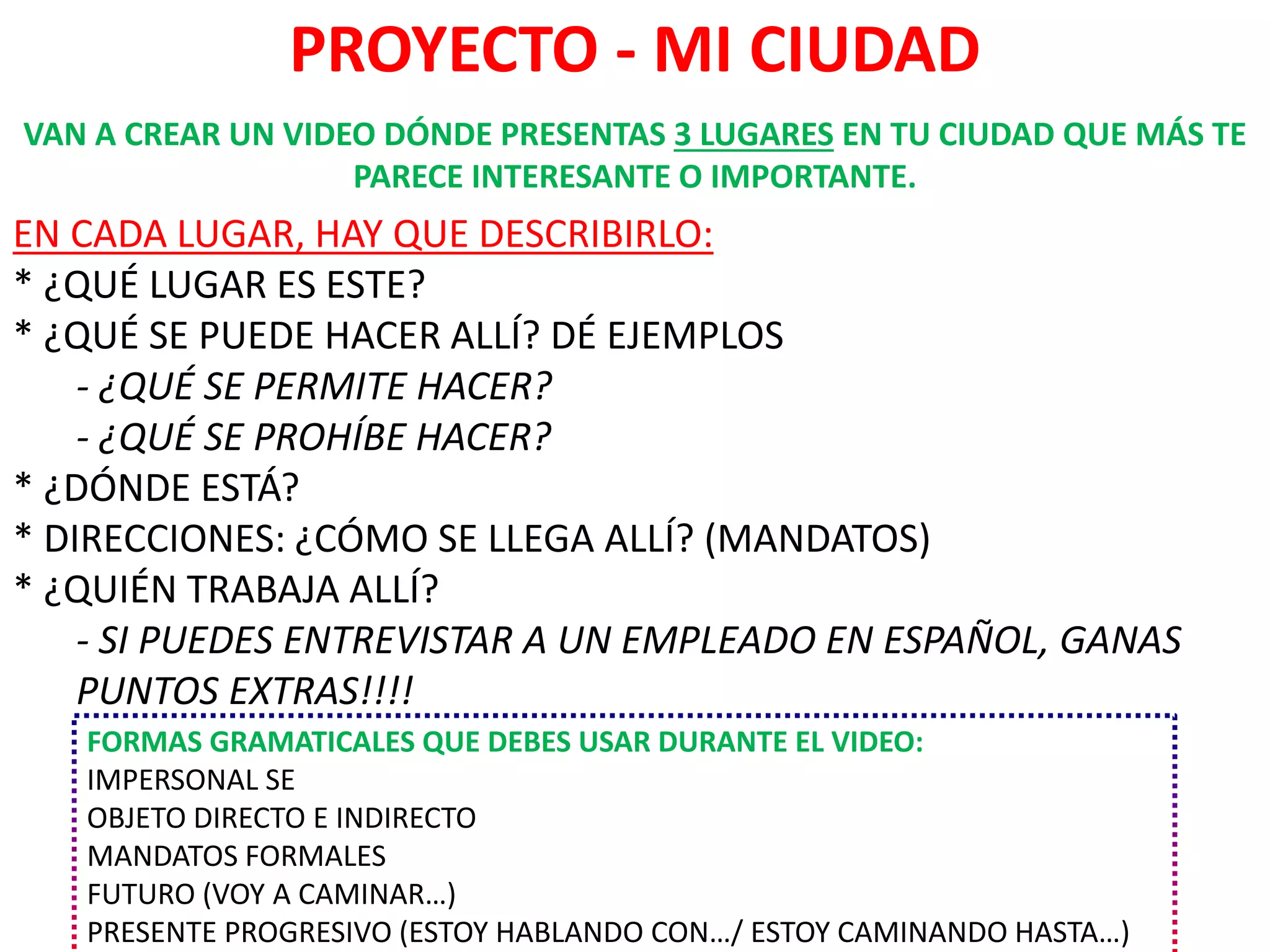 The document provides instructions for a school project where students will create a video introducing 3 interesting or important places in their city. For each place, students must describe the location, what activities are allowed and prohibited there, where it is located, and how to get there. Students should use impersonal se, direct and indirect objects, formal commands, and the future and present progressive tenses. A rubric is provided to evaluate students on details, accuracy, understandability, vocabulary, verb usage, spelling, and punctuation. Extra points are awarded for interviewing someone in Spanish.