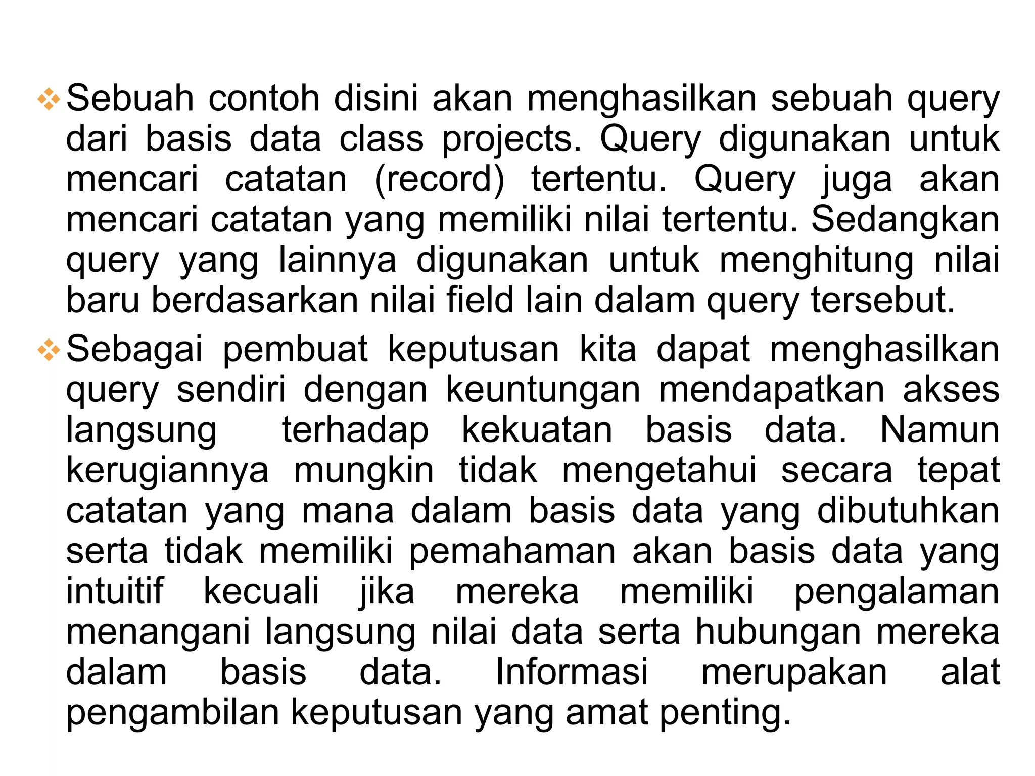 Dokumen ini membahas tentang tujuan belajar membuat query menggunakan satu atau lebih tabel database, membatasi hasil query, meminta input pengguna untuk batasan query, mencari nilai parsial pada field, dan membuat perhitungan di dalam query. Diberikan contoh query dari basis data projek untuk mencari rekord tertentu dan melakukan perhitungan baru berdasarkan nilai field lain.
