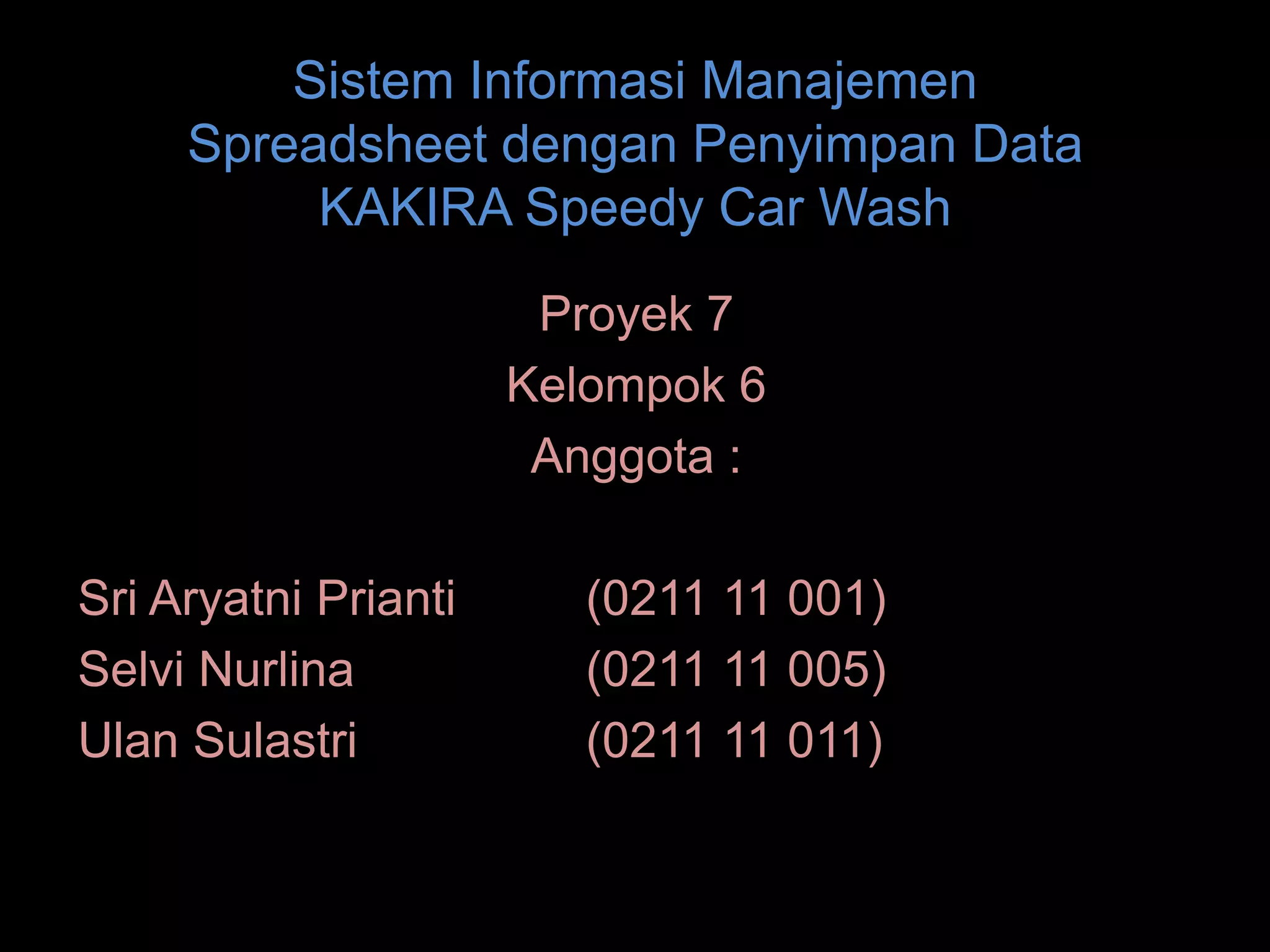 Dokumen ini membahas pengembangan sistem informasi manajemen spreadsheet untuk Speedy Car Wash, termasuk penggunaan formula, drop-down menu, tombol radio, dan kotak cek. Fitur utama mencakup perhitungan biaya dan pembayaran berbasis pilihan pengguna, serta pembuatan makro untuk mengefisienkan pemrosesan data. Proyek ini bertujuan meningkatkan pengalaman pelanggan dan mengelola data dengan lebih efektif.