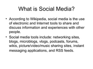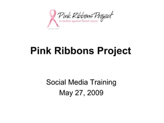 The document discusses social media and its importance for businesses. It provides statistics on social media usage such as over 200 million Facebook users and 11 million Twitter users. The document recommends ways for the Pink Ribbons Project organization to use social media tools like blogs, Facebook, and Twitter to engage audiences, raise awareness of its mission, and build relationships at little to no cost.
