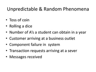 This document discusses probability theory and random processes. It defines key concepts such as random experiments, sample spaces, events, and probability. Random experiments are processes that can be repeated under the same conditions, with each repetition called a trial. A sample space contains all possible outcomes of an experiment. Events are subsets of outcomes from the sample space. Probability is defined axiomatically and through relative frequency. Examples are provided to demonstrate calculating probabilities of events using the classical definition. Properties of probability like mutually exclusive and conditional probability are also explained.