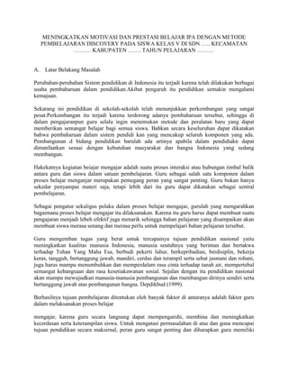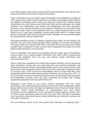Teks tersebut membahas penelitian tentang penerapan metode pembelajaran discovery untuk meningkatkan motivasi dan prestasi belajar IPA siswa kelas V di sebuah SD. Metode ini diharapkan dapat membuat siswa lebih aktif dalam proses pembelajaran dan menemukan konsep-konsep IPA secara mandiri."